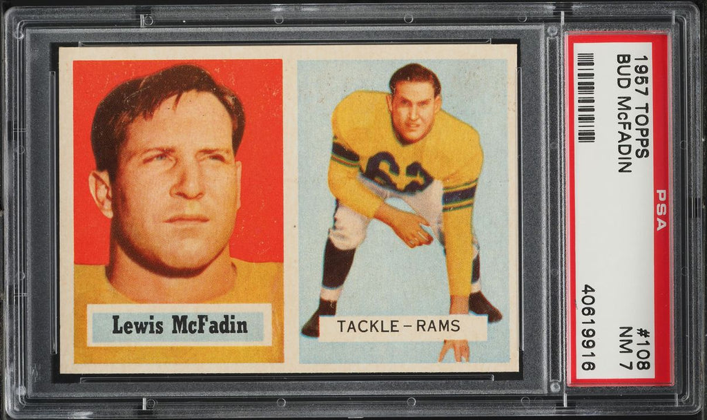 1957 Topps FB Card #108 Bud McFadin Los Angeles Rams ROOKIE RC HOF SP PSA 7 NRMT (MGD2)