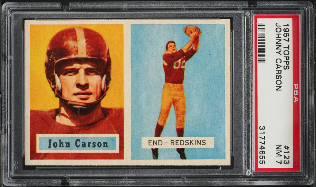 1957 Topps FB Card #123 Johnny Carson Washington Redskins SP PSA 7 NRMT (MGD2)