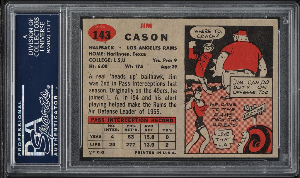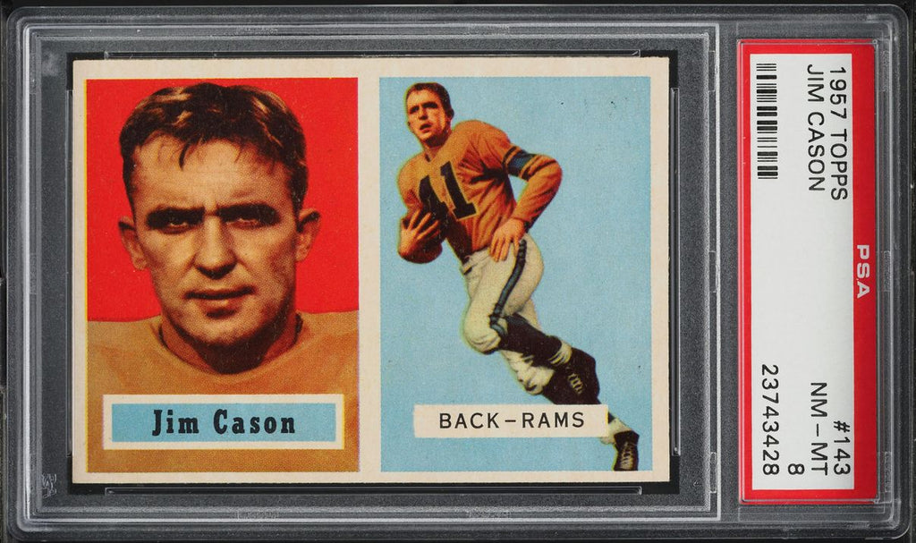 1957 Topps FB Card #143 Jim Cason Los Angeles Rams ROOKIE RC PSA 8 NM-MT (MGD2)