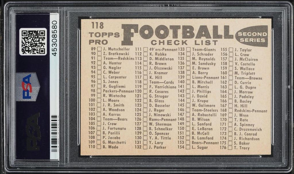 1959 Topps FB Card #118 Chicago Cardinals TEAM CARD CHECKLIST BACK PSA 8 NM-MT (MGD2)