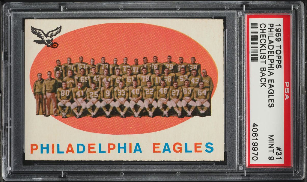 1959 Topps FB Card # 31 Philadelphia Eagles TEAM CARD CHECKLIST BACK PSA 9 MINT (MGD2)