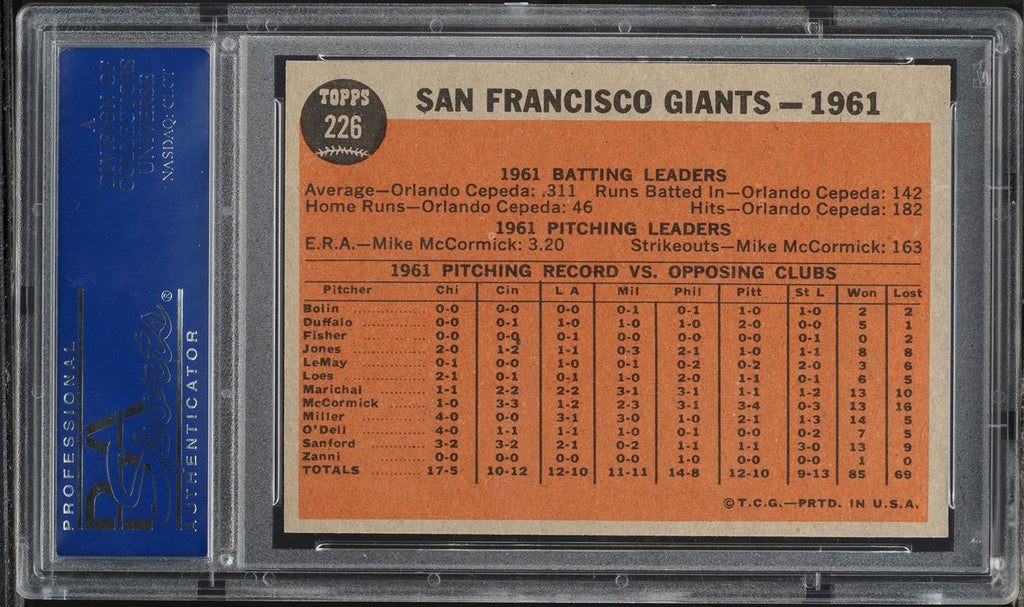 1962 Topps BB Card #226 San Francisco Giants TEAM CARD PSA 8 NM-MT (MGD2)