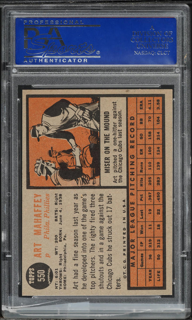 1962 Topps BB Card #550 Art Mahaffey Philadelphia Phillies SP PSA 8 NM-MT (MGD2)