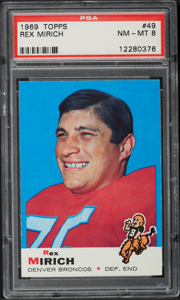 1969 Topps FB Card # 49 Rex Mirich Denver Broncos HOF PSA 8 NM-MT (MGD2)