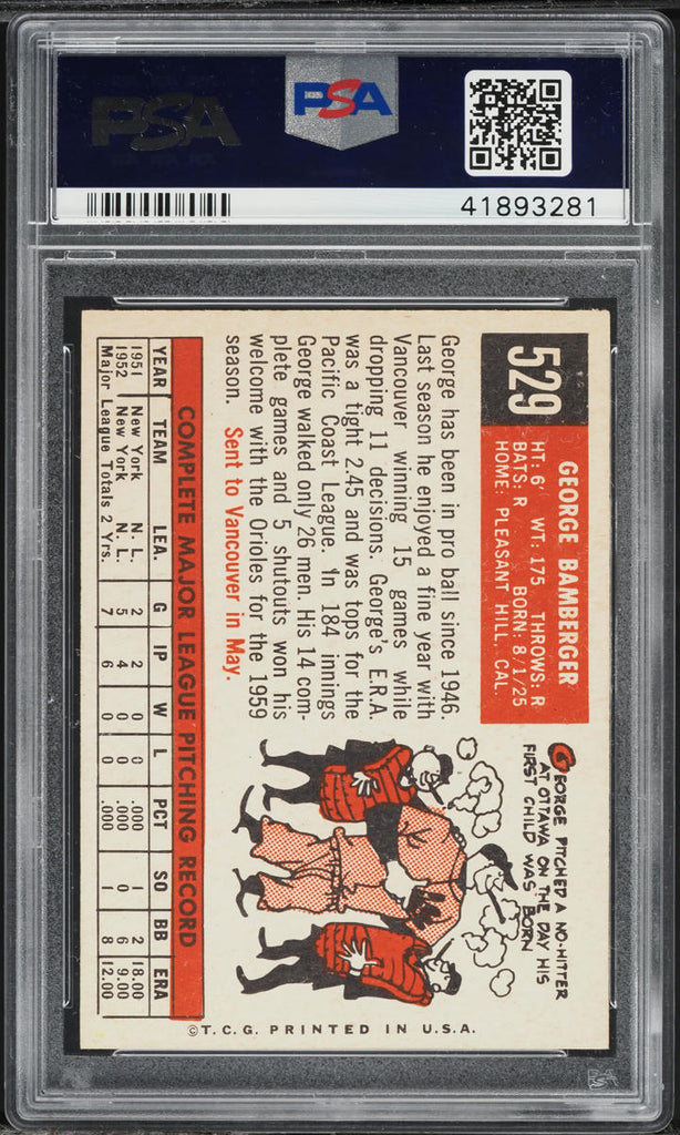 1959 Topps BB Card #529 George Bamberger Baltimore Orioles ROOKIE RC PSA 8 NM-MT (MGD2)