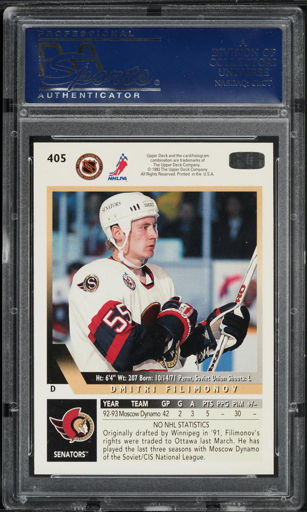 1993 Upper Deck Hockey Card #405 Dmitri Filimonov Ottawa Senators PSA 10 (MGD2)